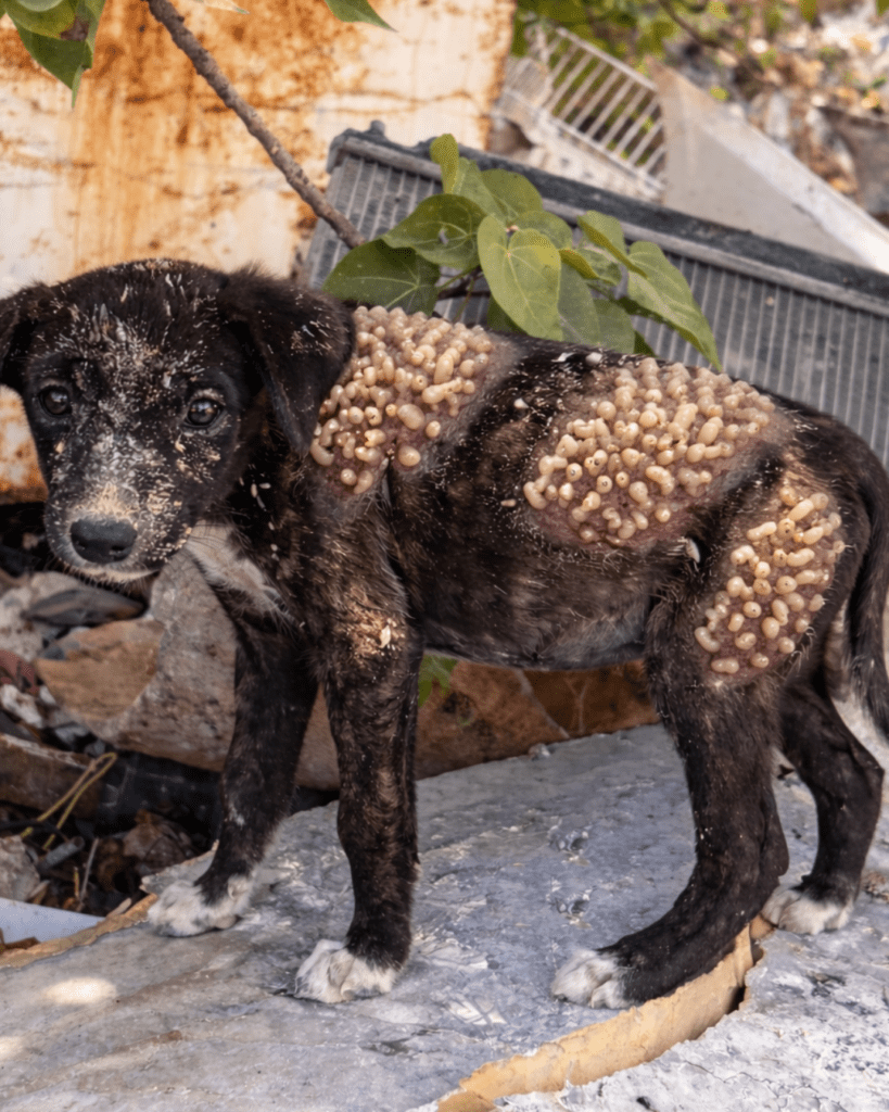 The parasites covering his body were not just external wounds, they were slowly stealing his strength from within, feeding on him day after day, leaving him weaker, thinner, and more exhausted, his fur falling away in patches, his skin raw and inflamed, his small legs barely able to support his weight, and still, even in that condition, there was something in his eyes that refused to disappear completely, a tiny spark of hope, fragile but alive, as if deep inside he still believed that someone, somewhere, might come for him.