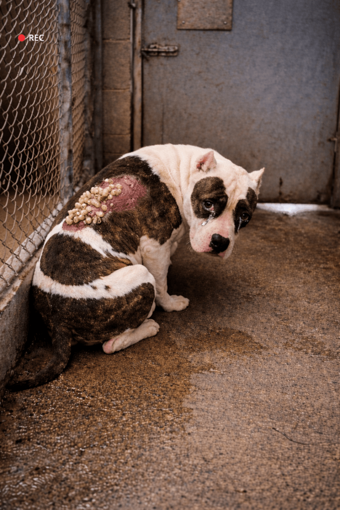 In a small, dark shelter corner, the dog sat curled up, trembling with fear and pain. His eyes told a story of suffering, neglect, and helplessness. But the most alarming sight was his back—covered with a severe maggot infestation. The wound was open, infected, and filled with hundreds of moving larvae feeding on his flesh. It was a clear case of advanced myiasis, a condition where flies lay eggs on wounds, and maggots begin to consume the tissue.