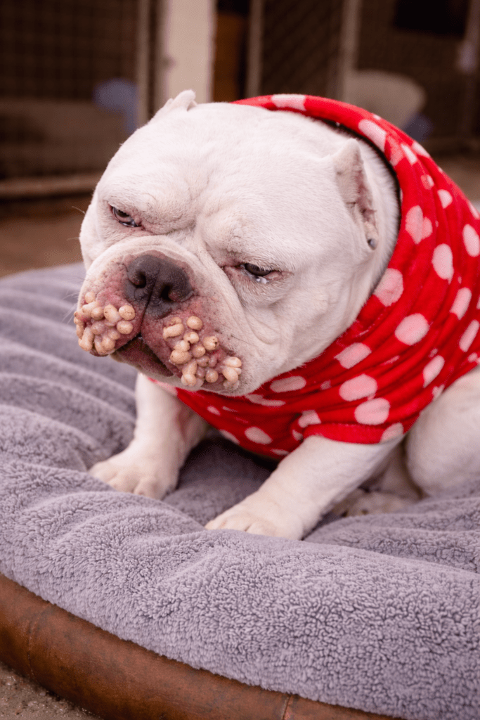 This is not just the story of one dog—it is the painful reality of countless voiceless animals who suffer in silence. The image you see reflects a deeply emotional and disturbing situation. A small dog sits quietly, wrapped in a red sweater, but his eyes tell a story of pain, exhaustion, and neglect. His once lively spirit now seems dim, overshadowed by the severe condition affecting his face.