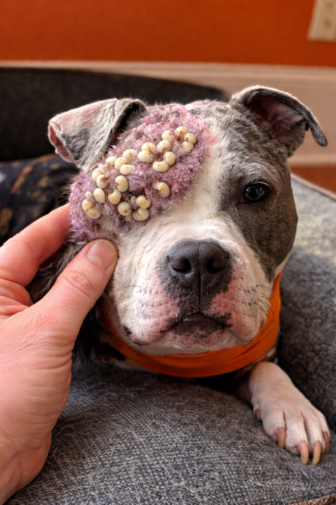One side of his face told a story no living being should ever have to endure. Where there should have been a bright, curious eye, there was instead a swollen, wounded patch of skin, overtaken by infection and crawling with maggots. The tiny creatures had made a home in his suffering, feeding on his flesh while he remained helpless, unable to escape the torment. His other eye, however, remained open — filled with a mix of confusion, दर्द, and a silent plea for help.
