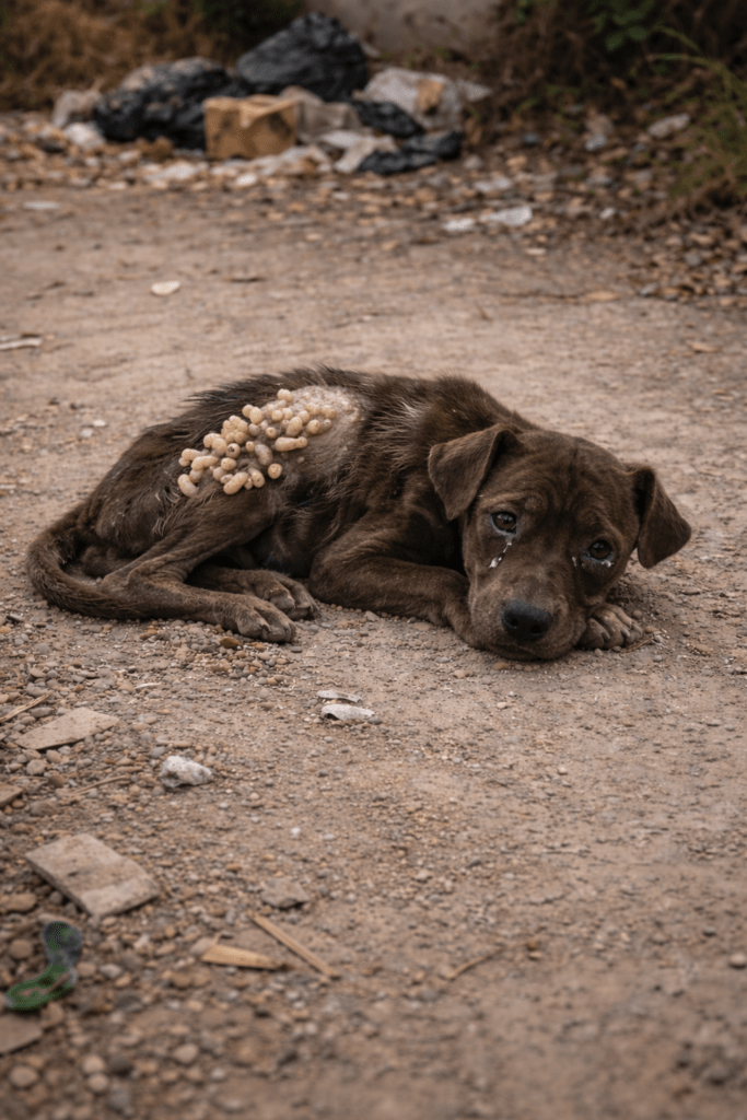 His fur, once soft and warm, was now dull and patchy. On his side, a terrible wound had grown—swollen, infected, and crawling with parasites. The pain must have been unbearable, but he didn’t cry out loudly anymore. Maybe he had learned that no one was listening. Maybe he had cried before, and no one came. So now, he lay silently, only the faint rise and fall of his chest proving he was still alive.