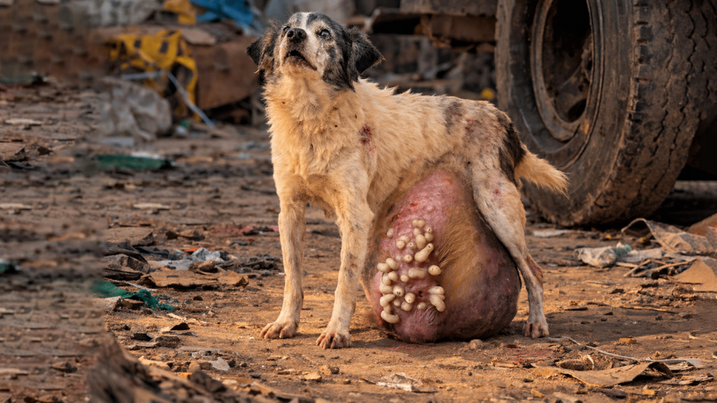The tumor hung beneath his fragile body like an unbearable weight, stretching his skin and making every step a struggle. Walking was no longer natural; it was a painful task that required effort and endurance. Yet, he kept moving. Not because he had somewhere to go, but because standing still meant giving up—and something deep inside him refused to surrender. His small legs trembled under pressure, his body weakened by time, hunger, and infection. Still, he walked. Still, he waited.