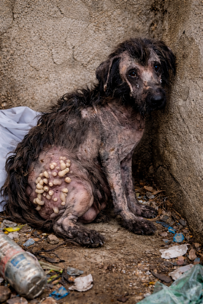 In a quiet corner of a neglected alley, where piles of garbage collect and the smell of decay fills the air, an old dog sits curled against a rough wall. His body is frail, his fur patchy and falling away, revealing wounded, infected skin beneath. Around him lie discarded plastic bottles, torn bags, and rotting waste—symbols of a world that has thrown him away just as carelessly.