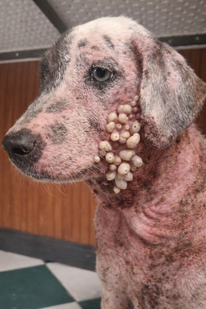 The dog in the image sits quietly, as if he has accepted the pain that life has handed him. His face, covered with painful growths and infections, tells a story that words alone can barely capture. This is not just a case of a dog skin disease—it is a reflection of neglect, abandonment, and the silent suffering that countless animals endure every day.